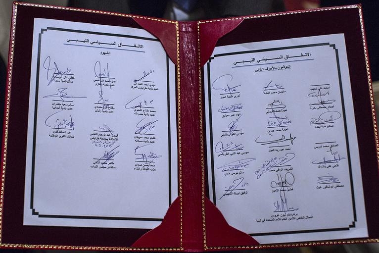 الصخيرات، المغرب، 11 يوليو 2015 - المشاركون في الحوار السياسي الليبي يوقعون بالأحرف الأولى على الإتفاق السياسي الليبي. الممثل الخاص للأمين العام للأمم المتحدة في ليبيا برناردينو ليون في كلمته الإفتتاحية: "وليست هذه إلا خطوة…