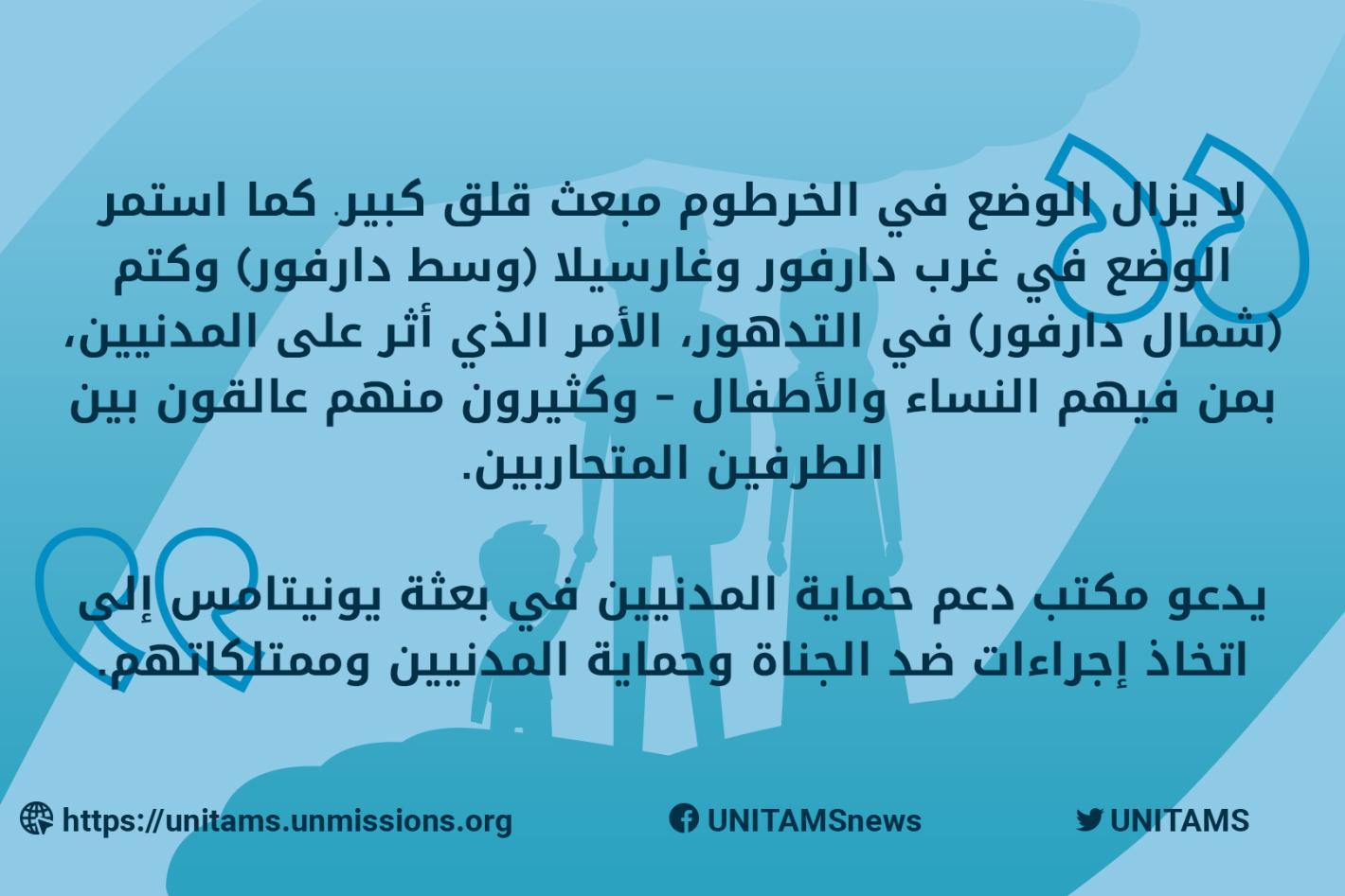 تعبر بعثة الأمم المتحدة المتكاملة لدعم المرحلة الانتقالية في السودان (يونيتامس) عن قلقها البالغ إزاء التأثير الخطير للقتال بين قوات الدعم السريع المدعومة من الميليشيات العربية والقوات المسلحة السودانية على المدنيين في منطقة…