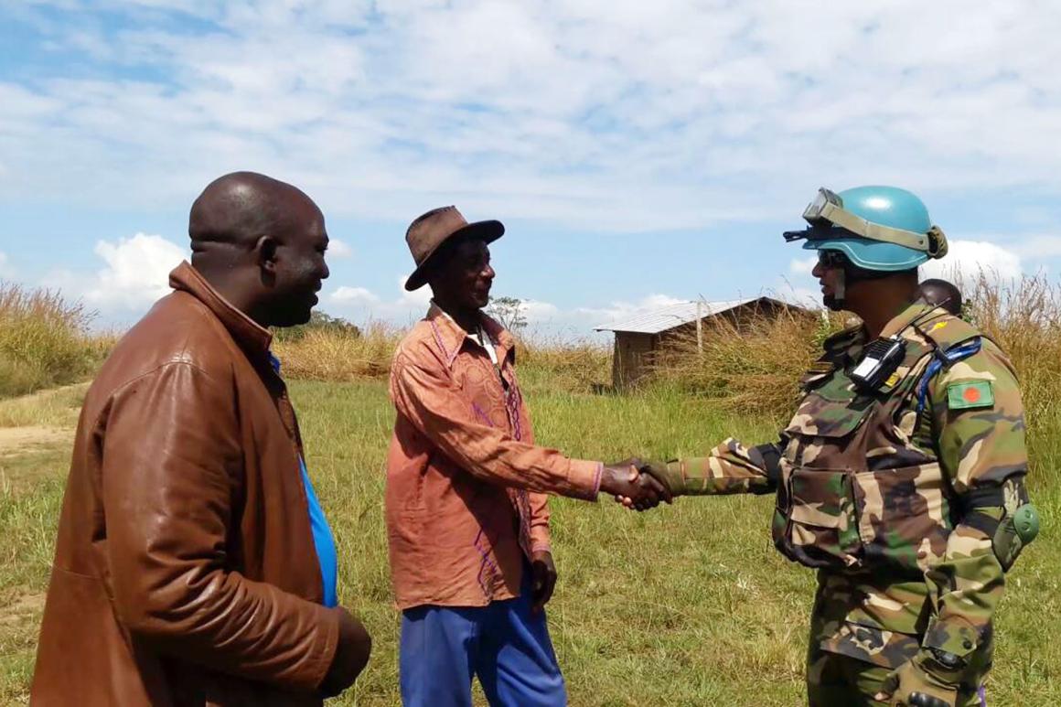 In the Democratic Republic of the Congo (DRC), Bangladeshi troops regularly patrol villages to ensure security. Above, a patrol commander from the Bangladeshi battalion meets with the chief of ADA village, in the Ituri Province of eastern DRC, during a routine security patrol. Bangladesh is currently the second-largest troop-contributing country to UN peacekeeping.