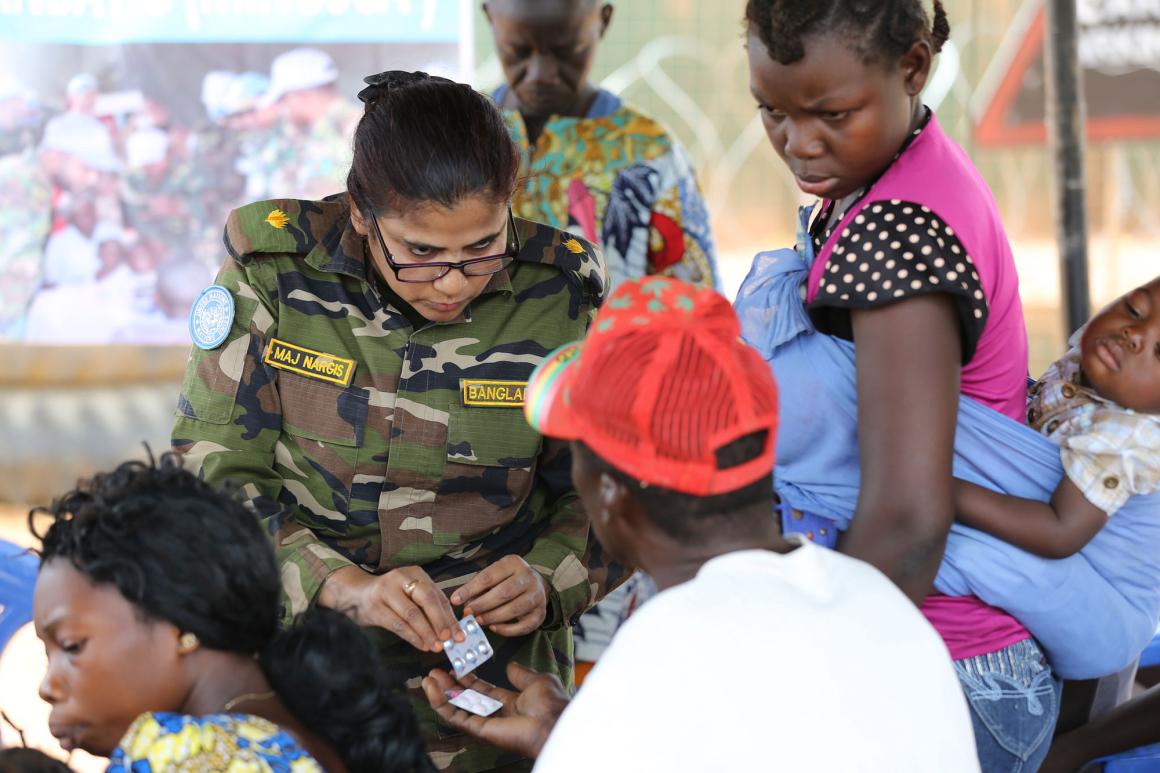Members of the Bangladeshi contingents play different roles in UN peacekeeping missions around the world. Pictured, a UN peacekeeper from Bangladesh provides free medical consultations to residents of a community in the Central African Republic.