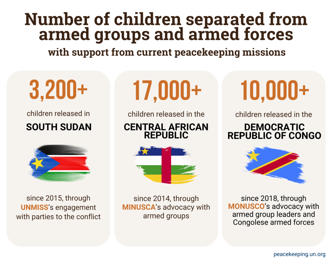 An estimated 250,000 children are still associated with armed forces and armed groups worldwide according to Red Hand Day, which raises awareness of the issue. Three peacekeeping missions – UNMISS, MONUSCO, and MINUSCA – are currently working with partners to reduce those numbers, and their work is having an impact: