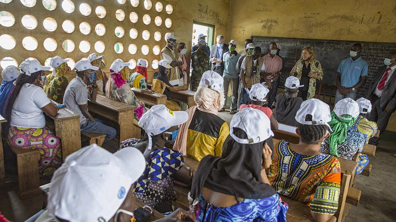 The Deputy Representative of the UN Secretary-General in the Central African Republic, Lizbeth Cullity, met with 80 beneficiaries of MINUSCA’s Community Violence Reduction (CVR) Programme, at two training centres – the Bon Berger School in PK5 and the Local Committee for Peace & Reconciliation in Bangui’s 3rd district – on 24 June 2021.