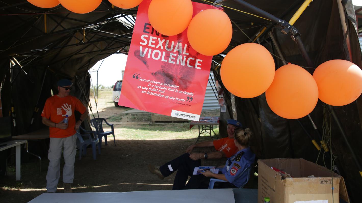Inside the ‘tukul’ (a grass-thatched hut where staff stream in and out for coffee, meals and other beverages), a television screen plays short video clips produced by the Mission’s Communications and Public Information Section. Orange banners and quotes in orange characters dominate the images on the screen. The Mission’s leaders and senior staff are taking a stand against sexual and gender-based violence, proclaiming the #HearMeToo hashtag.