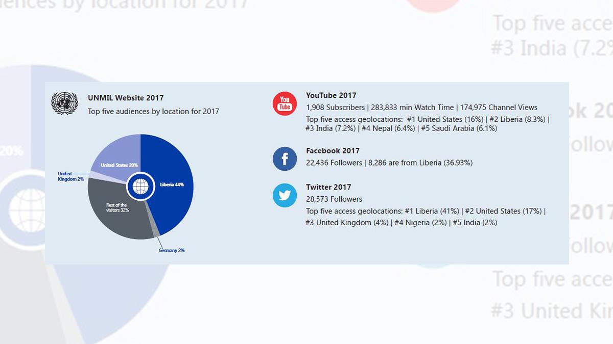 As the Mission was developing contemporary tools and platforms, however, Liberia’s use of them remained low. As of 2017, out of approximately 3.8 million mobile subscribers, about half a million used the internet, while only 7 per cent had Facebook accounts. But as the country’s three mobile phone companies compete for a growing market in a now peaceful country, internet and social media usage is growing fast. UNMIL’s web audience is mainly outside the country (60 per cent), with 40 per cent of the content being accessed by people in Liberia.