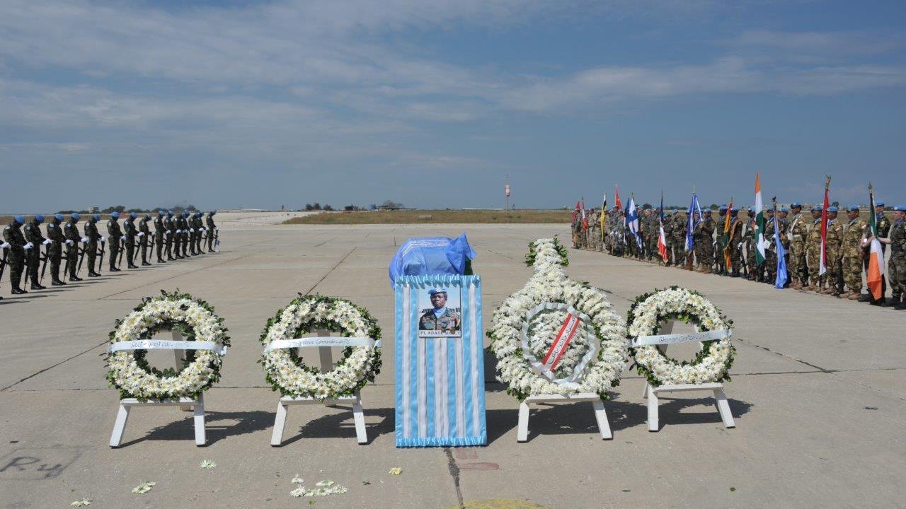 Major General Kharel, Brigadier General Haider and UNIFIL’s Sector West Commander, Brigadier General Rodolfo Sganga, laid a wreath at the airport in memory of late Cpl. Adade, whose body was flown back to Ghana today.