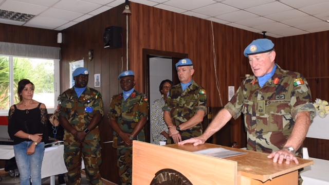 UNIFIL Head of Mission and Force Commander Major General Michael Beary, along with Sector West Commander Brigadier General Paolo Fabbri and Ghanaian Battalion Commander Lieutenant Colonel William Nortey presented a white flower, signifying bereavement, to each of the 70 Ghanaian female peacekeepers present at the ceremony.