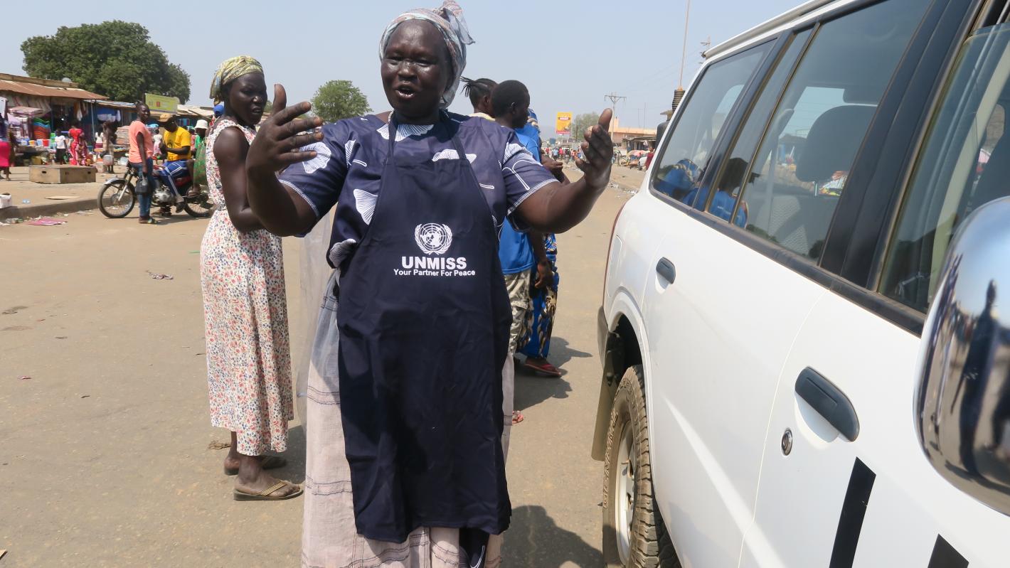 To sensitize communities across Juba, the UN Peacekeeping mission used a truck with loudspeakers that traversed major streets with constant stopovers to disseminate messages of peace and gender equality.