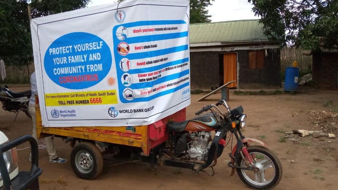 They teamed up with the Maridi Service Agency to use tricycles to take critical messages about prevention measures, such as frequent hand-washing and physical distancing, to remote areas. The campaign involves broadcasting audio messages and handing out informational pamphlets in multiple languages.
