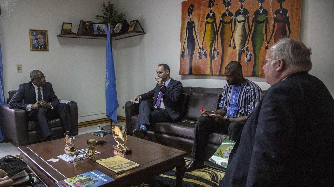 Executive Director Florian Irminger from Penal Reform International (PRI), an implementing partner for the MINUSCA Justice and Corrections Section, met with the SRSG Mankeur Ndiaye, on 31 October 2019, to update him on the demilitarization strategy for the Central African prison service. The PRI has supported the Government of the Central African Republic in the development of the strategy and a 5-year action plan for its implementation.