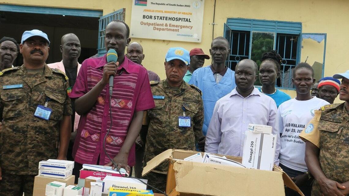 There are many ways to protect civilians, says Lieutenant-Colonel Desalegn Gulilat, commanding officer of UNMISS peacekeepers from Ethiopia. An example: he and his troops handed over essential medicines to Bor State Hospital, which, according to hospital authorities, will make a real difference in saving lives. Photo by Mach Samuel/UNMISS