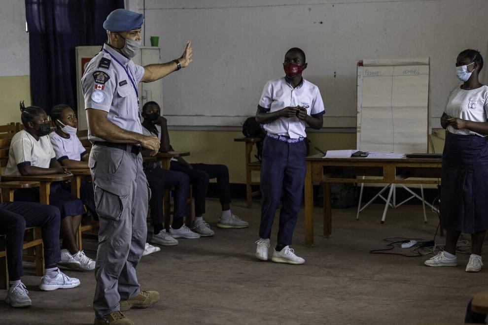 Jean-Guy Isaya, team leader of police officers specializing in gender-based sexual violence at UNPOL, interacts here with some students from the Don Bosco Ngangi Institute in Goma. / Photo: Kevin Jordan MONUSCO (UNPOL) Police…