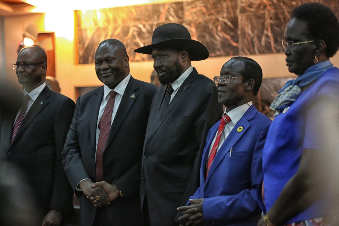 President Salva Kiir holding hands with his First Vice President Riek Machar and three of his four Vice Presidents. The fourth VP was appointed on 23 February. (Text produced by the UN News Centre, New York) In a statement…