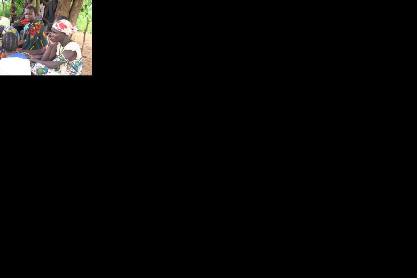 Civilians in Pageri listen attentively during a meeting with UNMISS peacekeepers during a patrol in Lobonok County, in the Jubek area. Recently displaced by fighting in the mountainous mining areas of Lobonok, civilians are…