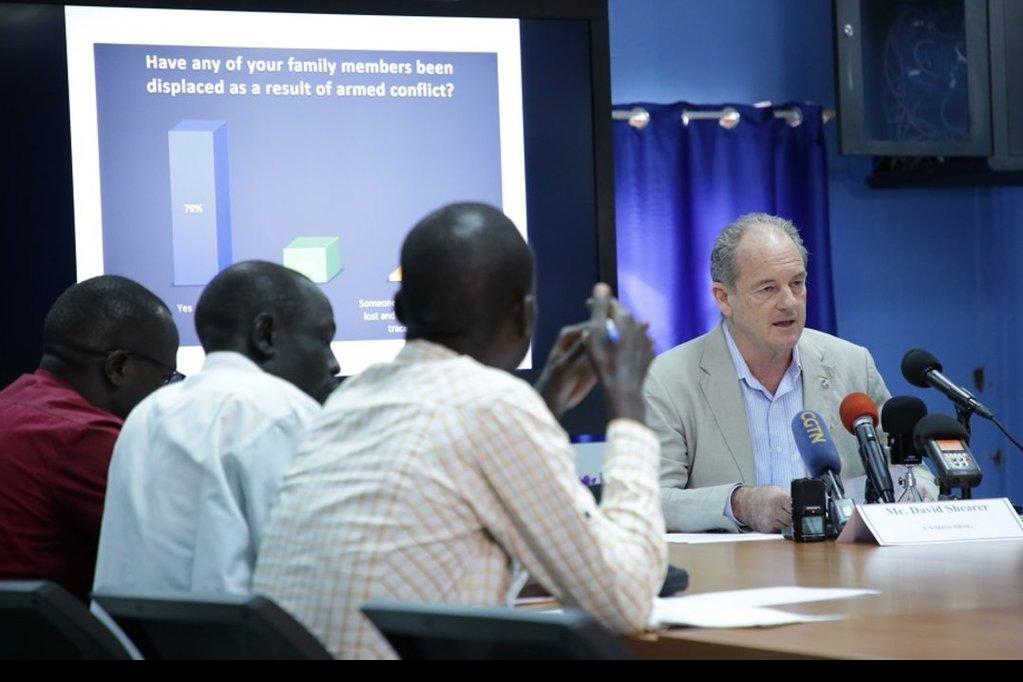 UNMISS chief David Shearer presenting encouraging results of a perception survey at a press conference in Juba. A new public opinion survey has found that 89 percent of South Sudanese believe that it is likely that there will…