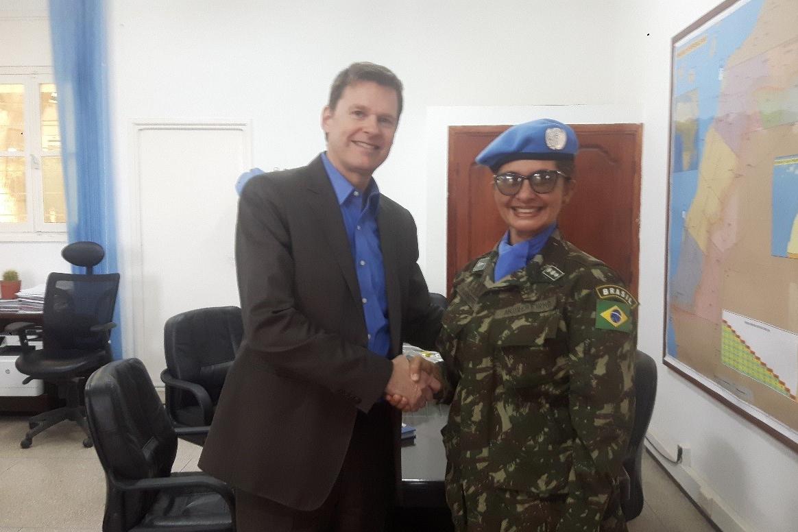 SRSG greeted LT COL Andréa Firmo On 25 April 2019, SRSG and Head of MINURSO, Colin Stewart, received in his office in Laayoune (Western Sahara), for a final farewell, Lt. Col. (Br. Ar.) Andrea Lourical Firmo de Araujo. Lt…