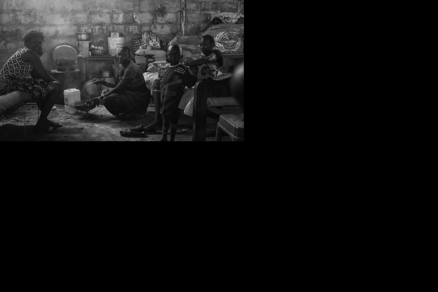Mangateen, relatively near central Juba. A makeshift camp for some 3,500 recently and voluntarily relocated displaced persons. We are standing outside a huge warehouse made to look small by the hundreds and hundreds of people…