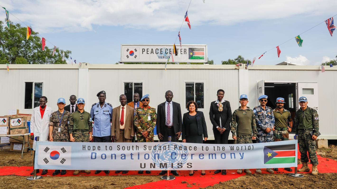 UNMISS and local officials pause for a group photo at the opening of the Dr. John Garang Memorial University of Science and Technology Peace Centre in Bor. The Dr. John Garang Memorial University of Science and Technology in…