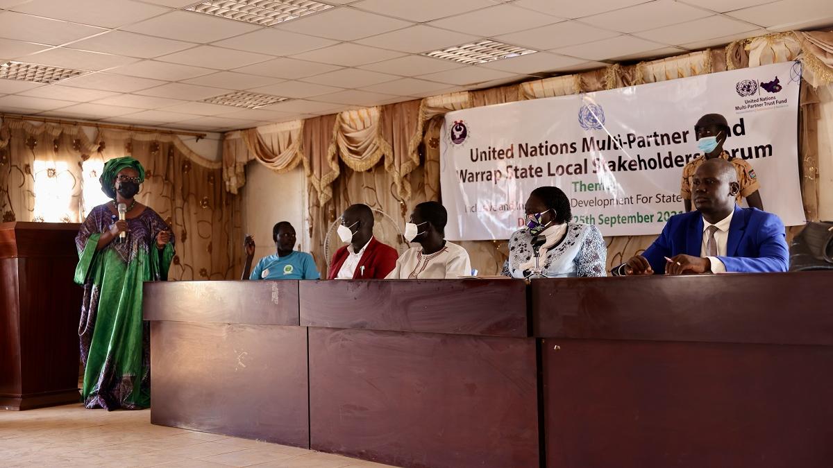 Some 80 people in Kuajok engaged in spirited discussions on the need to implement all provisions of the Revitalized Peace Agreement at a forum jointly facilitated by UNMISS and the United Nations Multi-partner Fund. Photo by…