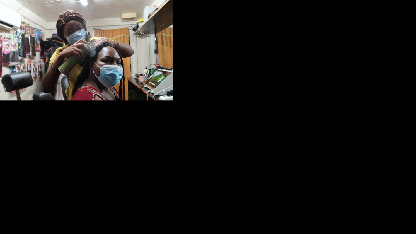 Ana James, 24, and Sunday Chol, 23, are sought-after hairdressers in Malakal, South Sudan. Both have no formal training in the beauty industry, but are passionate about entrepreneurship and fashion. Photo by Samson Liberty…