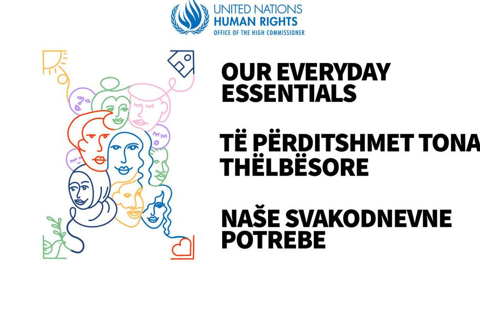 Graphic with the United Nations Human Rights logo at the top and the text “OUR EVERYDAY ESSENTIALS,” in bold black letters. It also includes this text in Albanian and Serbian. The background features colorful line drawings of faces and abstract shapes.
