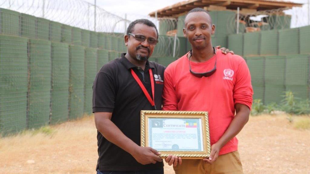 Sector Four Commander, Major Colonel. Mohamed Ibrahim awarded a certificate of recognition to UNMAS staff in the sector. The commander lauded UNMAS contribution in protecting AMISOM troops and reducing the impact of explosive hazards in Somalia. He remarked, “UNMAS is a dispensable part of our operations in Sector 4 and we thank them for continuous support.” UNMAS assists troops in sector four by providing training, equipment and mentorship to mitigate the threat of explosive hazards. This has enabled the AMISOM troops to deliver supplies to cities and assist delivery of humanitarian needs in the region.