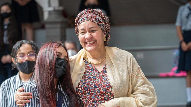 Amina Mohammed visita una escuela de mujeres en San José. “Saber que usted es vicesecretaria de la ONU y que fue una estudiante como nosotras, nos hace creer que también lo lograremos, así como usted lo hizo”, señala una chica.