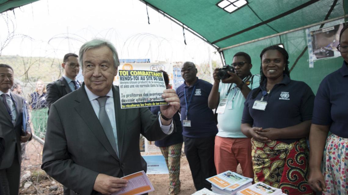 António Guterres visite le centre de transit et la Base militaire de la MONUSCO à Munigi. Photo UN/Martine Perret