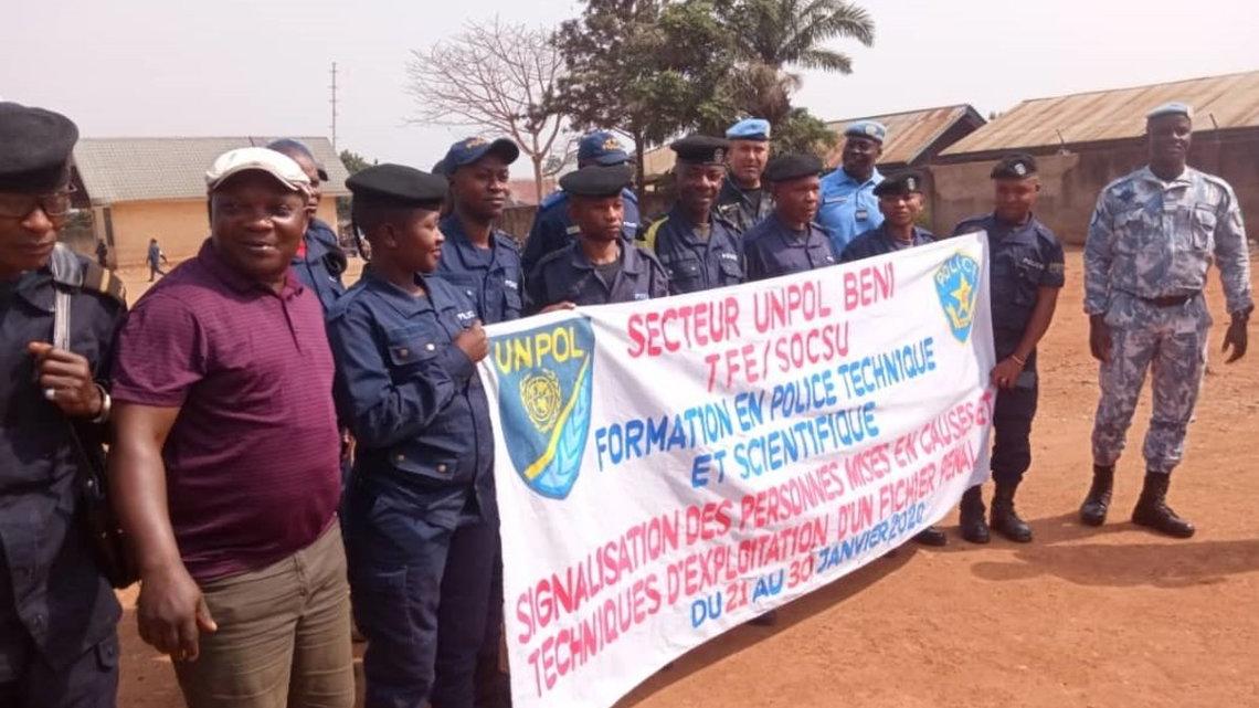 BENI, Nord-Kivu, 23 Janvier 2020 : C’est du 21 au 30 janvier 2020 que la Police des Nations Unies (UNPOL) a prévu de mettre à la disposition d’une vingtaine de cadres de la Police Nationale Congolaise (PNC) dont 02 femmes, son expertise, en matière de Police Technique et Scientifique (PTS). Cette formation est dispensée à l’intention de cadres de la PNC issus de la Police Judiciaire (PJ), de la Police Technique et Scientifique et de l’Unité de lutte contre les violences sexuelles faites aux femmes et aux enfants. Tous sont formés sur plusieurs thématiques dans le but essentiel de lutter contre l’impunité, la récidive et faire plus de lumière dans les enquêtes judiciaires.