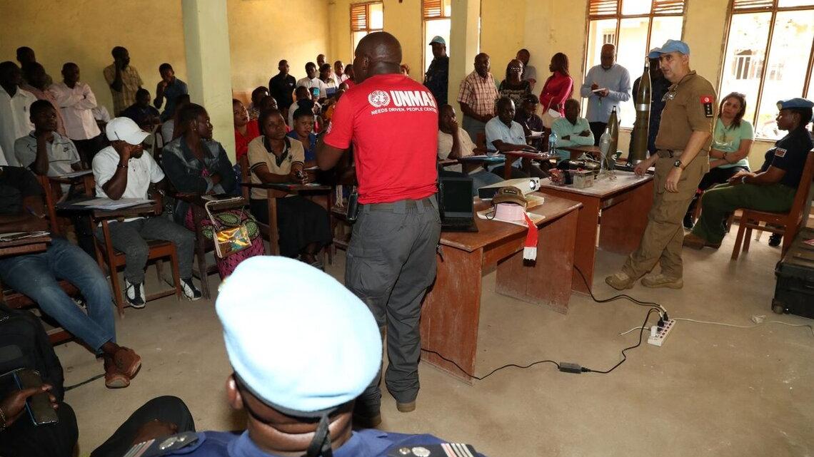 Durant environ deux heures, l’équipe de la MONUSCO a passé en revue avec les quelque 90 étudiants présents (dont une vingtaine de filles) plusieurs aspects de l’éducation aux dangers, notamment : les différentes catégories de mines terrestres, les bombes à fragmentation secondaire, la neutralisation et destruction des explosifs, la définition même d’un engin explosif improvisé, les restes explosifs de guerre ou encore les comportements à adopter face à une grenade ou pour renforcer sa sécurité personnelle.