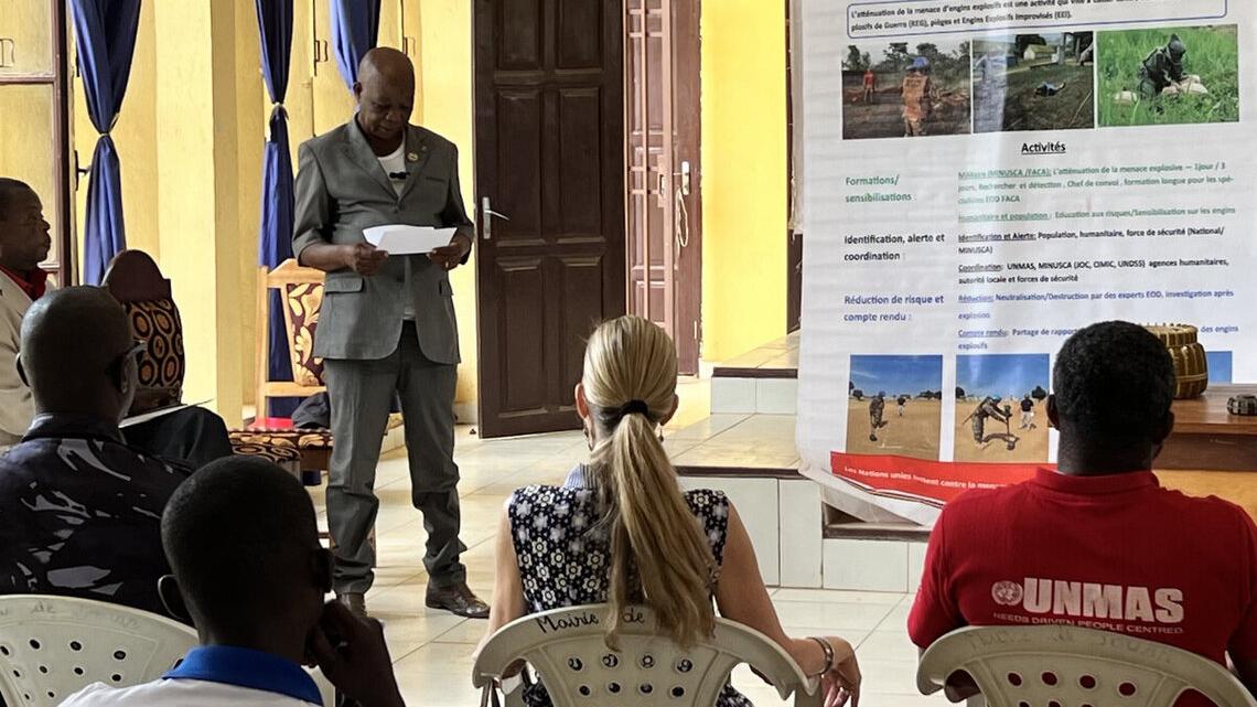 Cette journée a offert l'opportunité d'échanger avec une cinquantaine de participants, incluant des autorités locales, des leaders communautaires, des représentants des Forces de défense et de sécurité, des membres de la société civile, des agences onusiennes, de la MINUSCA et des ONG humanitaires. Les discussions ont porté sur les efforts déployés par UNMAS et la MINUSCA pour sensibiliser les communautés touchées par les engins explosifs, collecter des données pour identifier les zones dangereuses, neutraliser et détruire les engins explosifs, ainsi que former les forces de défense et de sécurité nationales à la gestion des armes et des munitions.