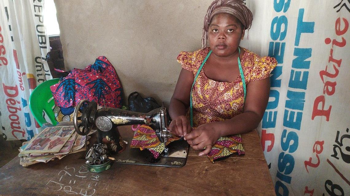 Seuls les cliquetis de la machine à coudre emplissent l’atmosphère de la petite salle où trônent tissus neufs, vêtements cousus, table de découpe et bouts de tissus travaillés. La mine concentrée, Elsie a les yeux rivés sur les va-et-vient de l’aiguille. Couturière travaillant à son compte depuis un peu plus d’un an, la jeune femme de 32 ans et mère de deux enfants ne badine pas avec la chance que lui a donnée la vie. Car dit-elle, elle vient de loin : « Avant je ne faisais rien, je restais à la maison. Un jour ma grande sœur m’a interrogée sur ce que je voulais faire dans la vie, car il n’était pas bon que je reste ainsi sans rien faire. Je lui ai répondu que je voulais faire la couture, mais je n’en avais pas les moyens. Elle a alors proposé de me payer une formation. J’ai donc travaillé comme aide chez divers couturiers […] mais les évènements de 2013 ont mis fin à mon activité. Je suis revenue à la case départ. »