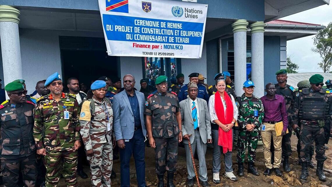 À Tchabi, la Mission a inauguré un commissariat de police moderne au profit de la communauté. Construit dans le cadre des projets à impact rapide (QIP), il est équipé de mobilier et de matériel informatique et vient remplacer un bâtiment vétuste datant de l’époque coloniale. La population y voit un signe d’espoir pour le retour progressif de la paix. Le gouverneur militaire, le général Johnny Luboya Nkashama, présent à l’inauguration, a annoncé le déploiement rapide d’éléments de la Police nationale congolaise afin d’assurer la protection des civils dans la localité.
