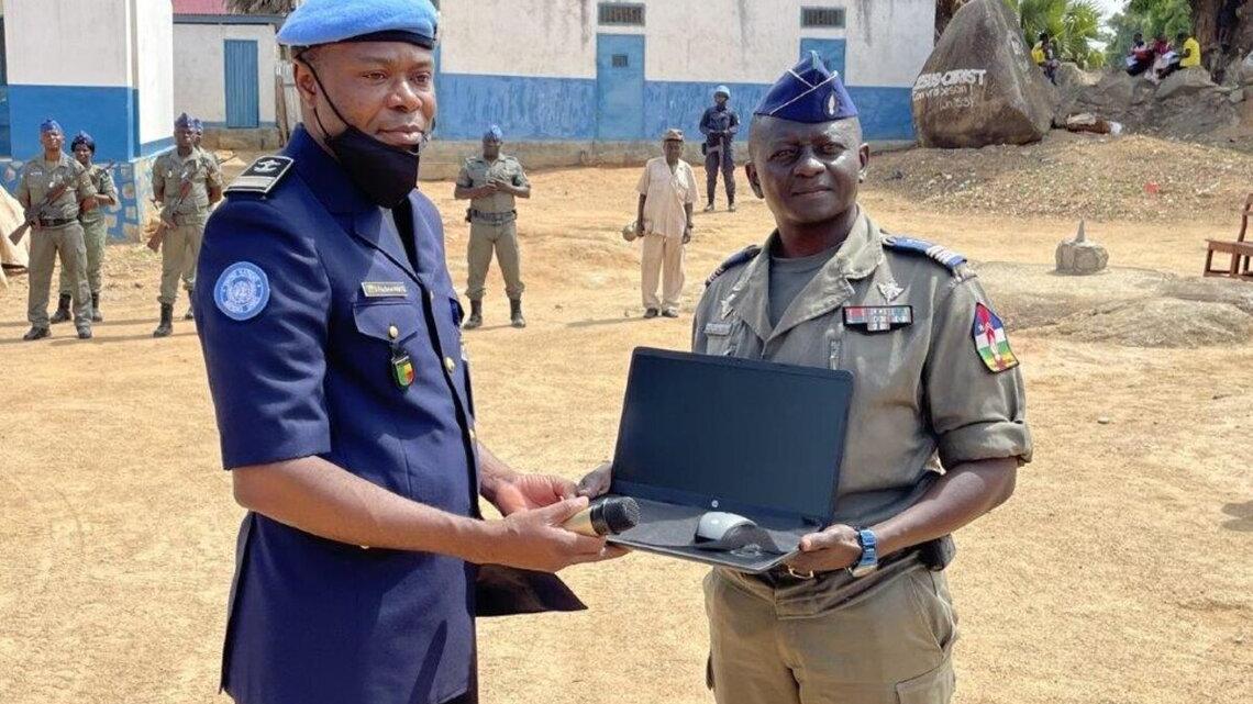 La MINUSCA, conformément à son mandat d’appui à la restauration de l’autorité de l’Etat, a remis, le mardi 5 avril 2022, un important lot de matériel bureautique et informatique, d’une valeur de 14 millions de FCFA, à la brigade territoriale de la gendarmerie et au commissariat de police de Bouar, en présence des autorités locales.S’exprimant au cours de la cérémonie de remise, le Commandant secteur Ouest de la police des Nations Unies, Dossou Pacôme ANATO, a rappelé que « ce projet d’équipement des Forces de sécurité intérieure (FSI) en matériel informatique, fournitures de bureau et groupes électrogènes vise à appuyer les FSI pour être totalement autonomes dans le cadre de l’exécution de leurs missions régaliennes », avant d’exhorter la population de Bouar et de ses environs à « collaborer avec les en participant activement à la Police de proximité pour une paix durable, gage de développement durable. »Quant au sous-préfet de Bouar et préfet par intérim de la Nana Mambéré, Norbert Niendé, il a témoigné que « la MINUSCA n’en est pas à son premier appui en faveur des FSI ». Il s'est dit réjoui que « ces équipements permettront d’assurer la confidentialité des services de police et de la gendarmerie, et éviter que l’administration ne soit dans la rue. »Représentant le ministre de l’Intérieur et de la Sécurité publique, le colonel Didace Namkianga a pour sa part loué les efforts de la en faveur de la restauration de l’autorité de l’Etat, à travers des actions de formation et d’équipement des FSI.