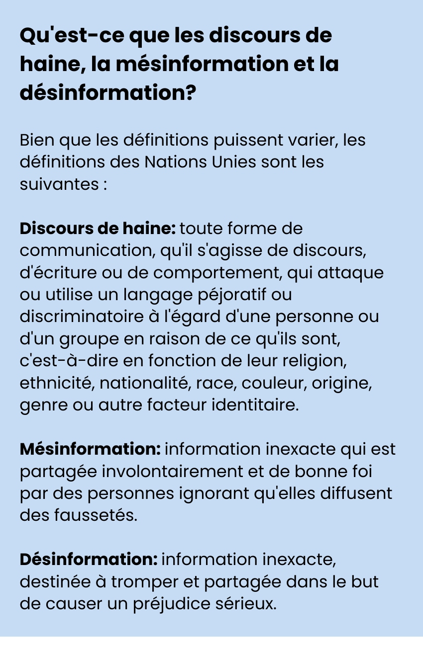 Le rapport révèle que même si les discours de haine, la mésinformation et la désinformation partagent des similitudes – telles que les tactiques utilisées pour les créer, les diffuser et les amplifier – il est essentiel de comprendre leurs différences pour y remédier efficacement. Cela inclut des différences significatives dans leur traitement en vertu du droit international, la manière dont l'identité est utilisée pour cibler des individus ou des groupes, leur considération par les plateformes en ligne ainsi que les types de préjudices causés.