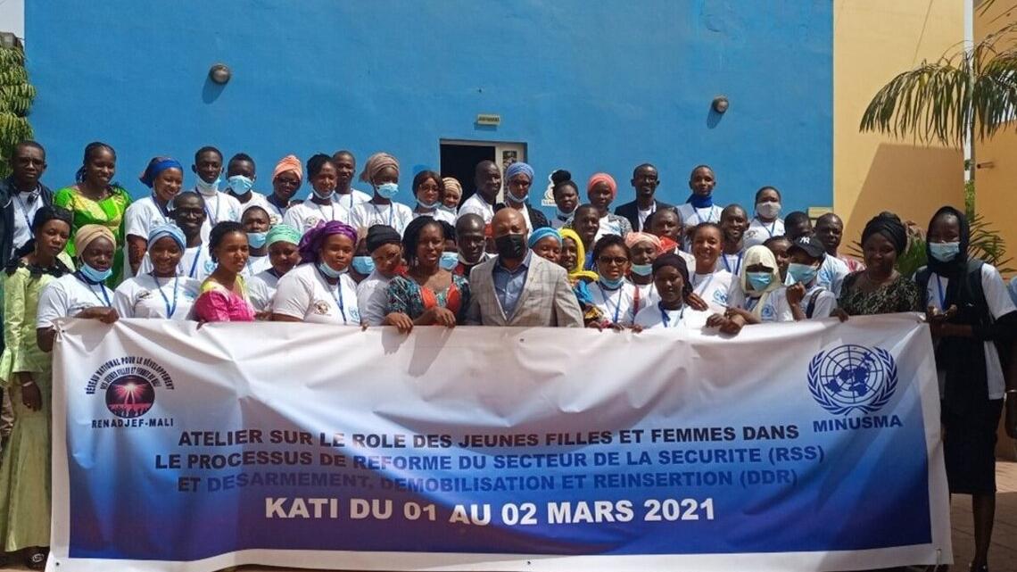 De plus en plus de jeunes maliennes et maliens s’impliquent pour accompagner le processus de la Réforme du Secteur de la Sécurité et du Désarmement, de la Démobilisation, de la Réinsertion (RSS-DDR) des ex-combattants. À Kati et Koulikoro, le Réseau National pour le Développement des Jeunes Filles et Femmes du Mali (RENADJEF-Mali) avec l’appui technique et financier de la MINUSMA, contribuent à la réussite de ce processus par la formation et l’information d’une centaine des femmes et de jeunes filles issues d’organisations de la société civile sur leurs rôles dans ce processus et ses différents aspects.