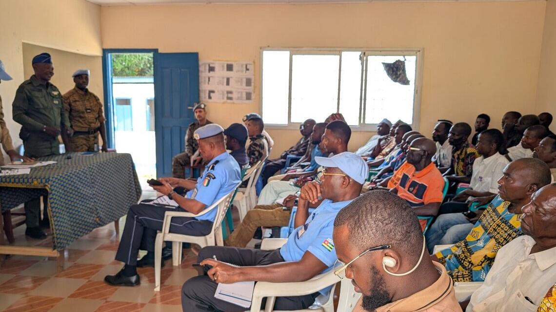 Installé depuis 2023, le poste de la police de la MINUSCA à Mobaye tient un rôle prépondérant dans la protection des civils, aussi bien à l’intérieur de la ville que sur les principaux axes y menant. Partant de leurs observations, fondées sur leur soutien aux forces de sécurité intérieure (FSI) et leurs interactions avec les communautés, les Casques bleus ont choisi d’aborder, au cours de cette semaine, des sujets ayant un impact direct sur la vie des civils, notamment les violences faites aux femmes et aux filles (VBG) et la sécurité routière.