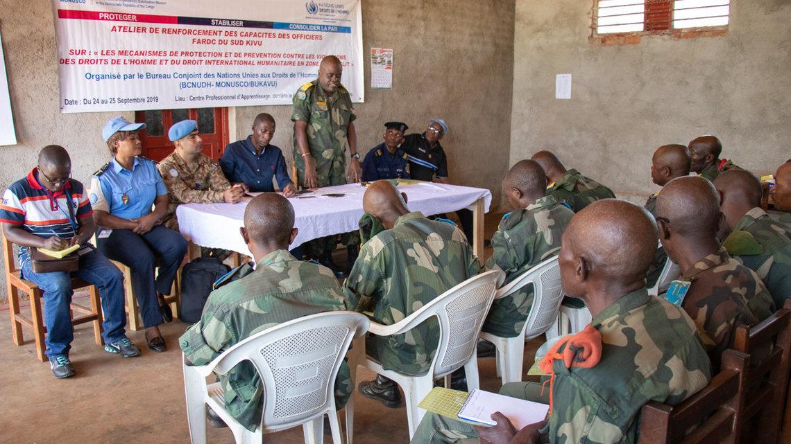 Bukavu, le 24 septembre 2019 – Au Sud-Kivu, le Bureau Conjoint des Nations Unies aux Droits de l’Homme (BCNUDH) a débuté une série de formations sur les mécanismes de protection et de prévention contre les violations des Droits de l’Homme et du Droit International Humanitaire en zone de conflit. C’est à l’intention des commandants et officiers de l’armée (FARDC) et de la police (PNC) congolaises.