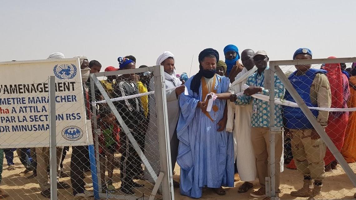 Les 21 et 24 Janvier derniers, le bureau de la MINUSMA à Tombouctou a remis deux projets de réduction de la violence communautaire à leurs bénéficiaires dans la ville de Tombouctou. Le premier concerne le renforcement de la résilience des communautés d’Attila, à travers la réalisation d’un système d’adduction d’eau et l’aménagement d’un périmètre maraicher de 3 hectares au profit des populations. Le second comporte la construction d’un complexe sportif pour les jeunes du quartier d’Abaradjou par la commune urbaine de Tombouctou. Ces réalisations, d’un coût global de près cent millions de francs CFA, ont été financées par la Section de la Réforme du Secteur de la Sécurité, Désarmement, Démobilisation et Réintégration (RSS-DDR) de la MINUSMA.