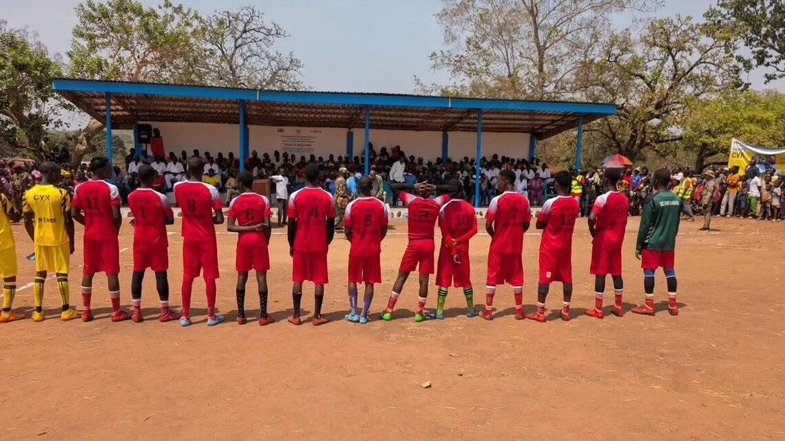 La commune de Benzambé, dans la préfecture de l’Ouham, dispose désormais d’un terrain de football. Il s’agit d’une aire de jeu aménagée avec une tribune moderne, construite par la MINUSCA dans le cadre de son programme de réduction de la violence communautaire (CVR). L’ouvrage a été officiellement remis aux autorités communales le 14 février 2025 par la Cheffe du bureau de la MINUSCA, en présence du Gouverneur de la région de Yadé.