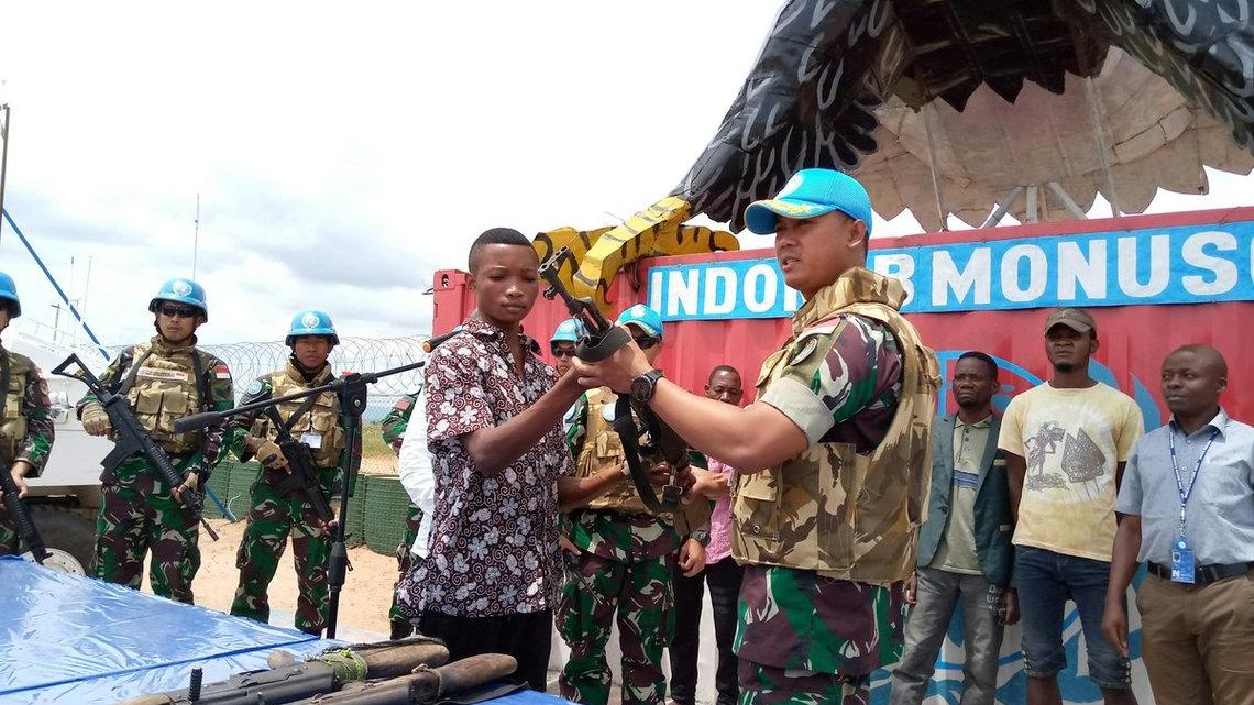 Kalemie, mardi 7 janvier 2020 : Trente personnes, dont dix-sept ex-miliciens d’auto-défense, 8 femmes et 5 enfants, se sont rendus au Camp des Casques bleus indonésiens à la Monusco Kalemie lundi 6 janvier 2020, où ils ont déposé 3 armes de marque AK 47, 6 chargeurs avec minutions et environ 200 cartouches. Témoins de l’événement, le Chef de Bureau ad intérim de la Monusco et les autorités militaires provinciales. Cette action rentre dans le cadre du programme de Réduction des violences communautaires que la MONUSCO a initié depuis quelques années dans la Province du Tanganyika et ailleurs en RDC à travers sa section DDR.