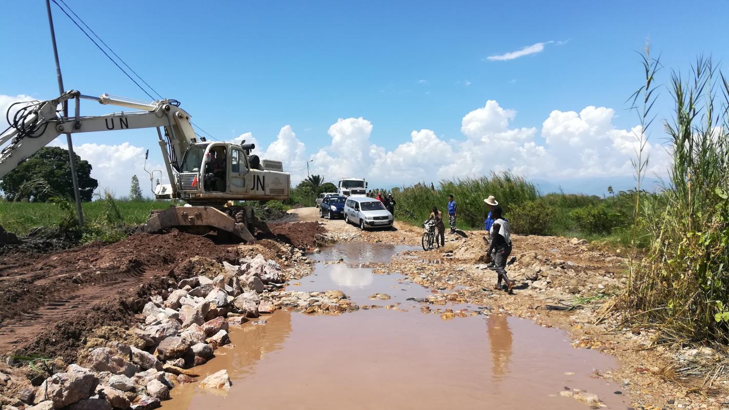 Engins lourds du génie civil du contingent chinois en plein travaux pour arrêter le passage de l’eau, donnant ainsi la possibilité aux véhicules privés et de transport de reprendre leur mouvement. Photo MONUSCO/Bilamekaso TCHAGBELE