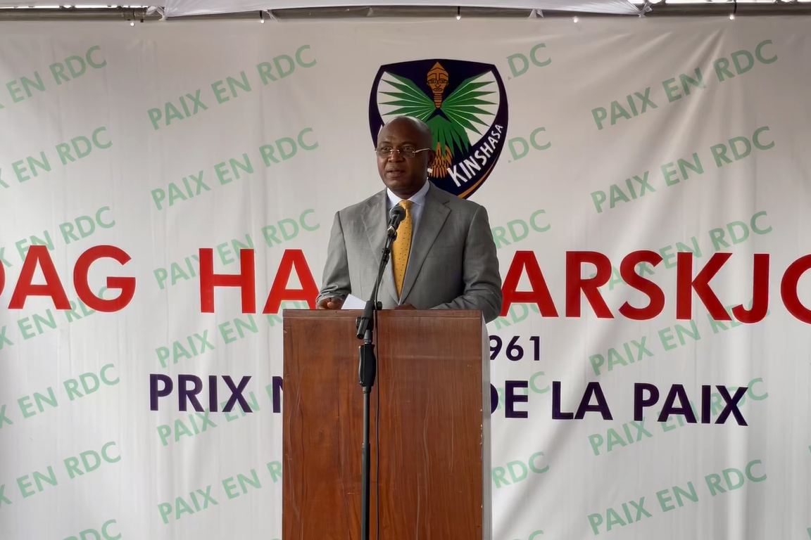 Le gouverneur de la ville de Kinshasa, Gentiny Ngobila, rendant hommage au Secrétaire général Dag Hammarskjöld le 17 septembre 2021 à Kinshasa. Photo MONUSCO/Lydie Betyna « Monsieur le Secrétaire général des Nations unies…