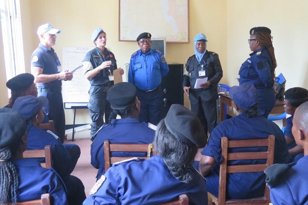 Séance de formation du personnel féminin de la PNC sur les questions de violences sexuelles basées sur le genre (VSBG) au siège de l’État-Major PNC à Kalemie. Photo MONUSCO/Marcelline COMLAN Déclaration aux médias – Pour…