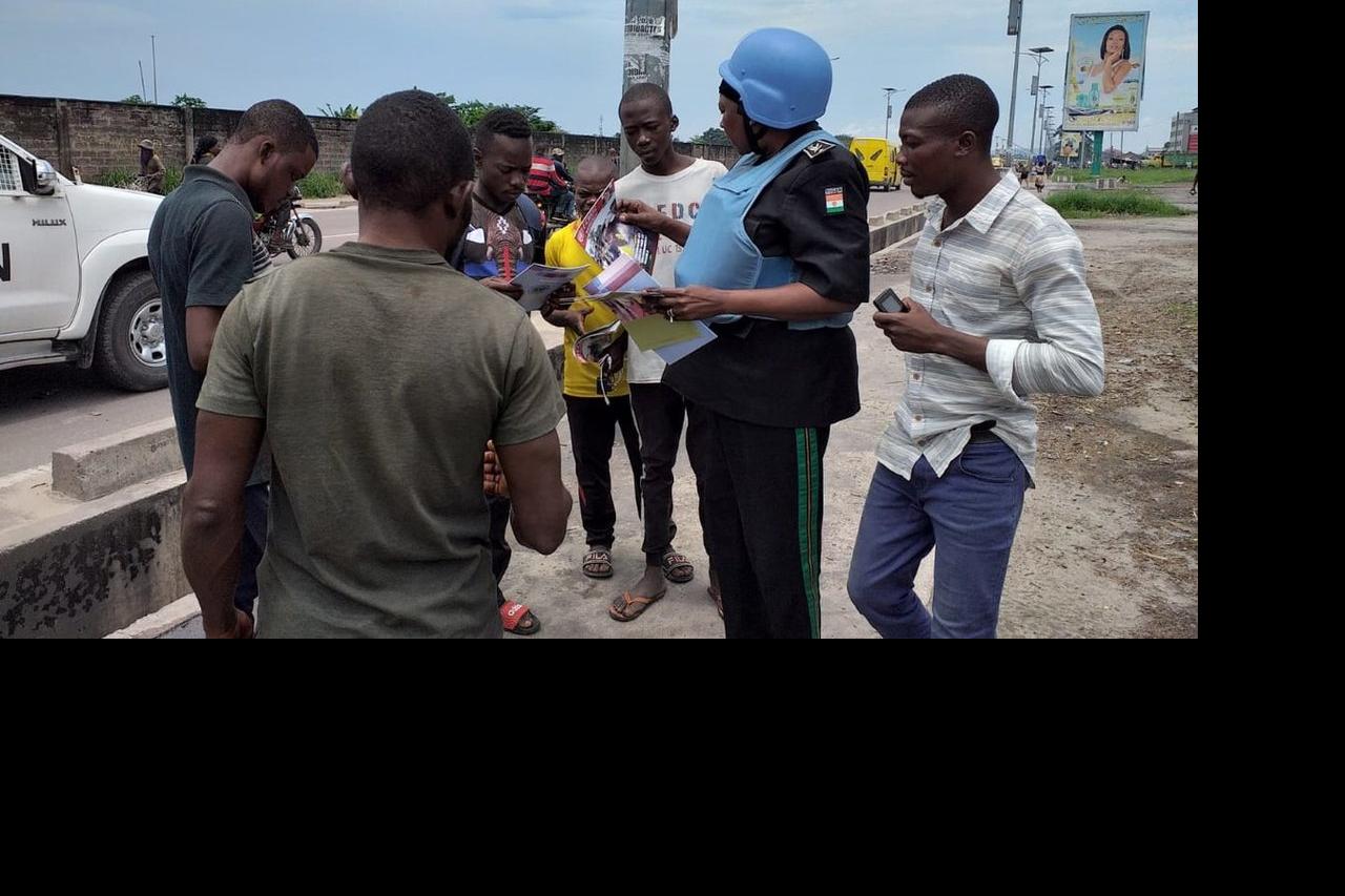 Une équipe de patrouille de la Police onusienne sensibilise des jeunes sur le mandat de la MONUSCO. Photo : MONUSCO/UNPOL Dans le cadre la protection des civils, une équipe de patrouille conjointe composée de l’officier…