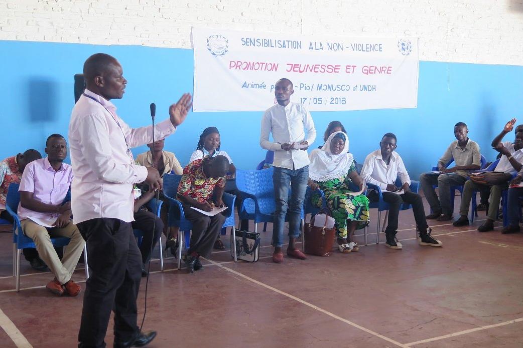 Participants à la rencontre «Jeunesse et Genre». Photo MONUSCO/Marcelline Comlan Kalemie, le 17 mai 2018 – La Section de l’Information publique de la MONUSCO, à Kalemie, en partenariat avec le Conseil de la Jeunesse du…