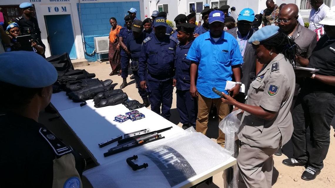 L’officier de police des Nations Unies et cheffe intérim du sous-secteur d’Uvira, Noélie Kere Compaore, fait découvrir aux invités un échantillon des différents équipements objet du don de la police des Nations Unies (UNPOL)…