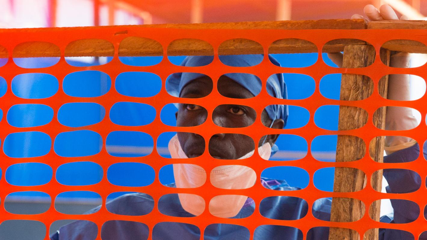 Derrière une clôture rouge en filet, la nourrice Fanta Camara donne un bain à Massidigbe, un an et demi, dans la crèche du centre de traitement Ebola (CTE) à Nzérékoré, située dans la zone forestière de la Guinée. C’est une bonne journée pour la petite fille: sa mère sortira du CTE où elle était soignée après avoir contracté Ebola. Apres la mort du père de Massidigbe du virus Ebola, elle fut mise immédiatement sous observation à la crèche qui sert également de zone temporaire de d’observation. Tous les enfants ici ont perdu au moins un parent du virus Ebola. Ils ne peuvent rentrer à la maison que lorsque le parent traité au CTE est guéri et s’ils ne développent pas de symptômes de la maladie après quelques jours.