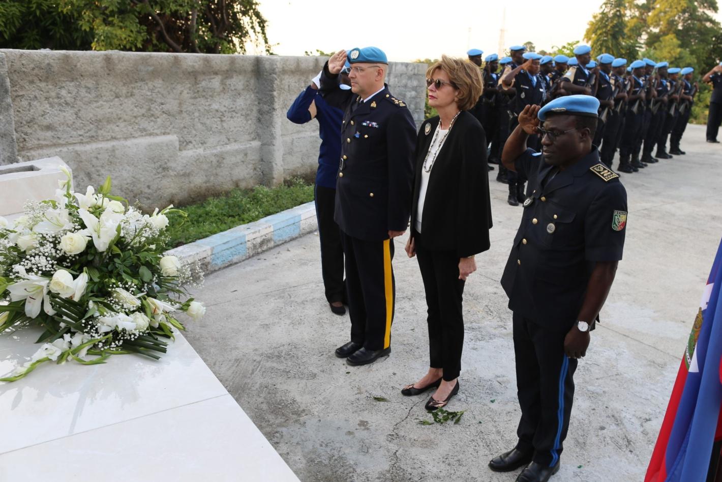 La Représentante spéciale du Secrétaire général des Nations Unies et Chef de la MINUJUSTH, Mme Helen La Lime, et le Commandant de la Composante Police, M. Serge Therriault, se recueillent sur le site de l’ancien quartier général de la Mission de paix en Haïti. © UNPOL Djibrilla Mahamadou Hafizou / UN / MINUJUSTH, 201914 janvier 2019MINUJUSTHSéisme de 2010 en Haïti : "Mon frère a perdu sa vie parce qu’il croyait passionnément en ce pays"