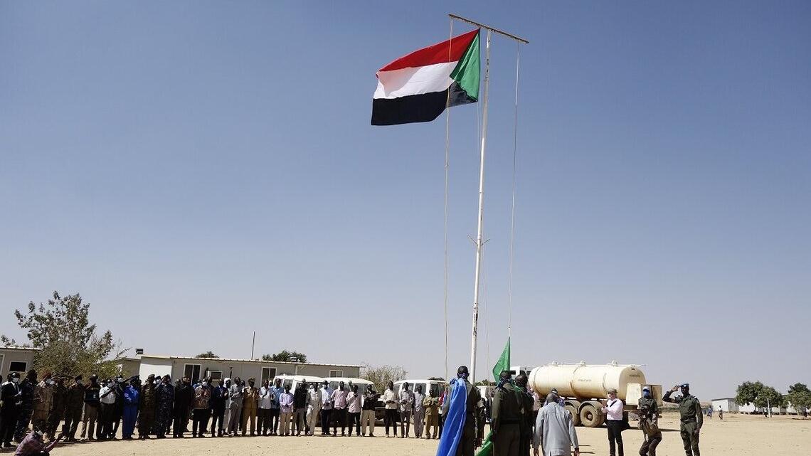 وكممارسة معتادة في احتفالات التسليم هذه، فقد تم إنزال علمي الأمم المتحدة والاتحاد الأفريقي وتم رفع العلم السوداني.