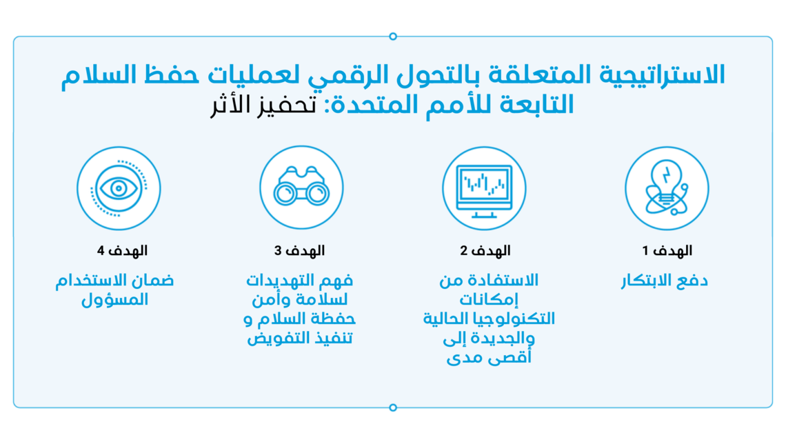 ولتحقيق هذه الأهداف، تبني الاستراتيجية على المبادرات والاستراتيجيات السابقة والحالية ذات الصلة في مجالات مثل استخبارات حفظ السلام وتقييم الأداء للتخطيط واتخاذ القرار وأمن المعلومات أو إدارة البيانات، وتتصدى للتحديات مثل تسليح التكنولوجيا من قبل الجهات الفاعلة غير الحكومية والهجمات الإلكترونية والمعلومات المضللة والمغلوطة وخطاب الكراهية والمسائل الأخلاقية الرئيسية المتعلقة باستخدام التكنولوجيا الرقمية في عمليات حفظ السلام التابعة للأمم المتحدة.